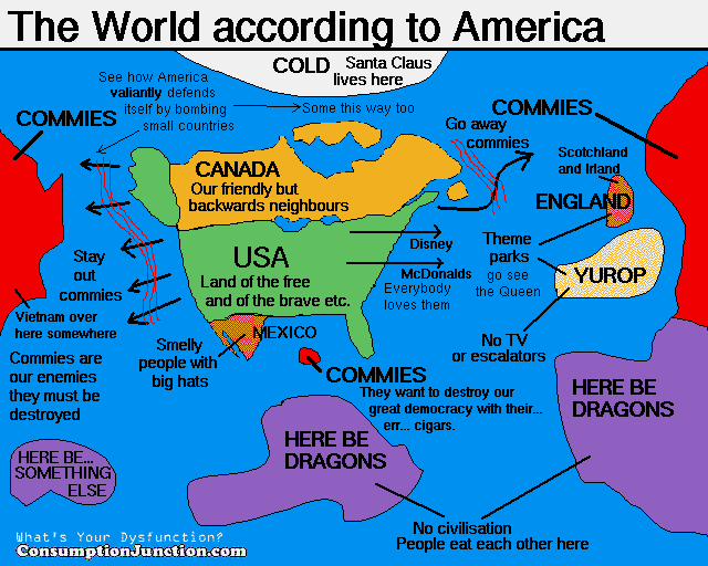 W załączniku obrazek świata widziany z perspektywy przecientnego amerykanina.